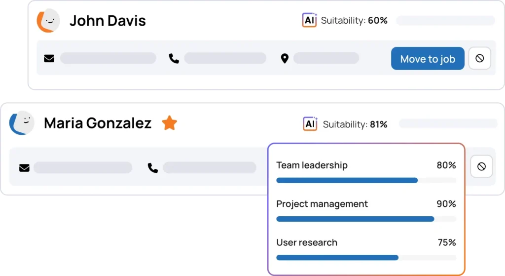 Stop scanning, start interviewing. Our AI instantly identifies top applicants by scoring skills and experience against your job needs. Get a clear percentage match for every candidate so you can focus your energy on the people who fit best.