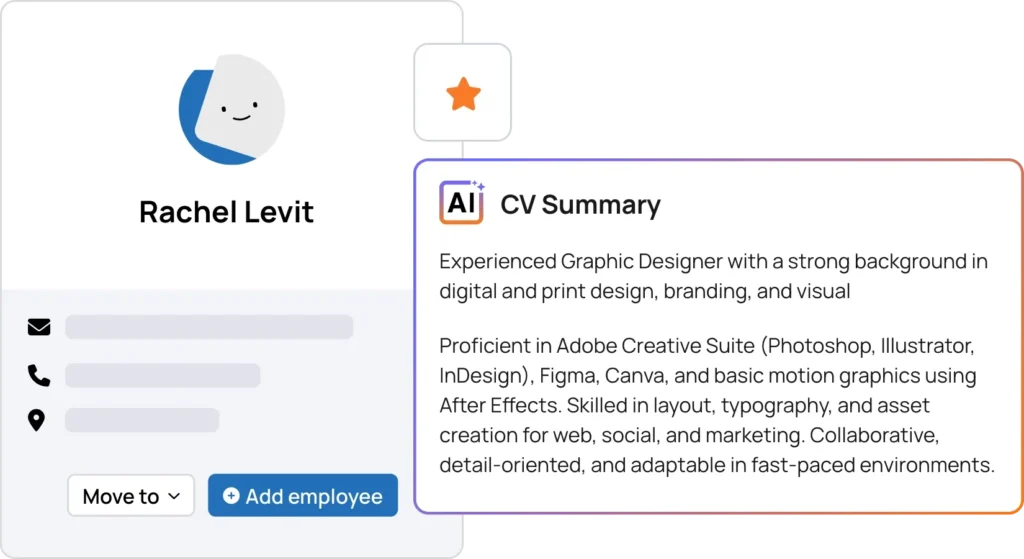 Don’t lose track of the details. Our AI creates concise summaries of every candidate’s background and qualifications, making it easy to compare profiles at a glance and make faster, more informed hiring decisions.